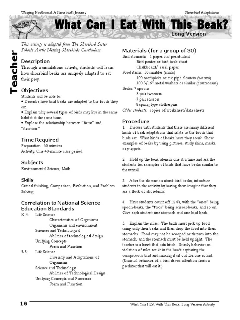 Adaptations in bird's beaks worksheet. This worksheet is set up for three food types and four beak . Adaptation—for the birds (birds and their beaks). Find adaptations of bird beaks lesson plans and teaching resources. Learn all about birds and beak adaptations with this activity: